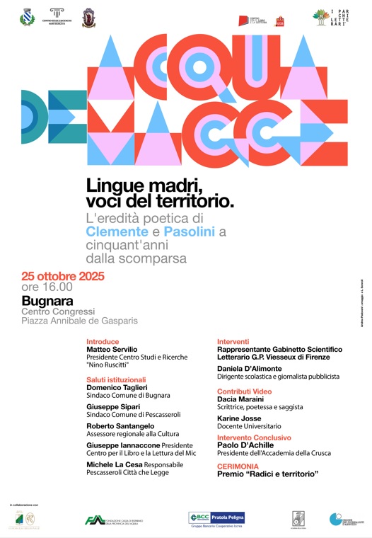 Venerdì 25 ottobre 2025, alle ore 16.00, presso il Centro Congressi di Piazza Annibale de Gasparis a Bugnara si terrà il convegno "Lingue madri, voci del territorio. L'eredità poetica di Clemente e Pasolini a cinquant'anni dalla scomparsa", promosso da Bugnara e Pescasseroli "Città che legge" con il sostegno organizzativo del Centro Studi e Ricerche "Nino Ruscitti" e del Premio Nazionale di cultura Benedetto Croce.
